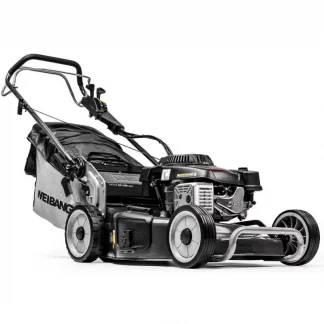 The 46 SP has the same 46cm (18″) Steel cutter deck with 3 in 1 function for collection, rear discharge, and mulching. Powered by the WEIBANG X140 engine (139cc) with primer and featuring single speed self drive, the 46 SP also has a central height of cut lever (20-70mm) and a 55L grass collector with airflow fabric.